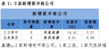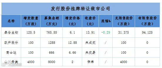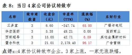 点评:4家新增发行股份并挂牌转让做市企业,1家下跌、2家正常交易未成交、1家停牌未申报。