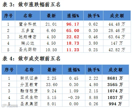 个股表现:当日10家公司成交额破千万。其中联讯证券、西安同大和分豆教育位居前列,分别成交8681万、7500万元和3565万。