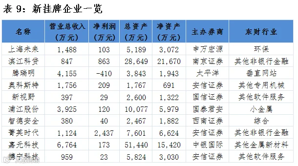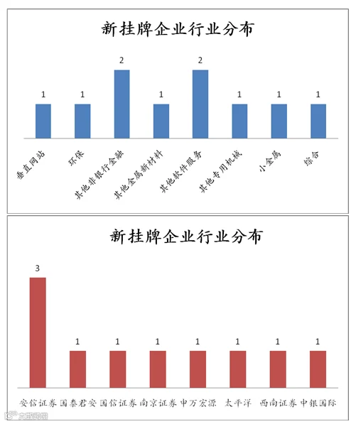 点评:当日新增10家公司,其中上海未来为新股首发做市公司。新挂牌企业中,其他非银行金融与其他软件服务行业占比较大;主办券商方面,安信证券占比较大。