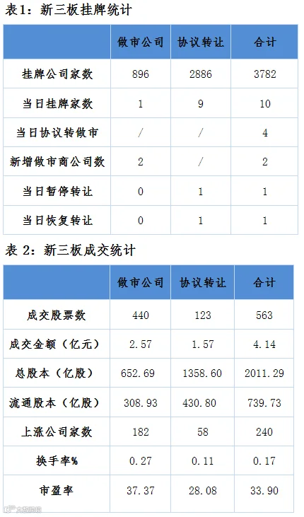 三板昨日有563只个股参与交易,其中240只个股上涨。成交额继续低落,仅4.14亿元。其中做市公司成交2.57亿、协议转让公司成交1.57亿。