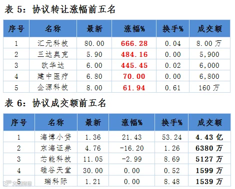 涨跌幅方面,芍花堂、天信投资和苍原种植涨幅居前,分别为15.83%、13.64%和13.23%。相比之下,众益传媒、合建重科和软通股份则跌幅居前分别为16.92%、16.47%和12.83%。