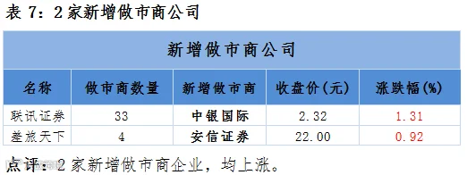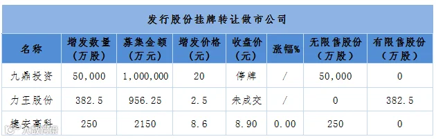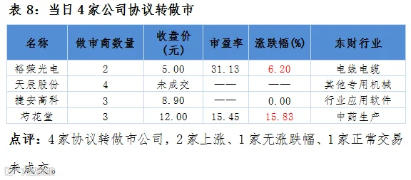 点评:3家新增发行股份并挂牌转让做市企业,1家无涨跌幅、1家正常交易未成交、1家停牌无申报。