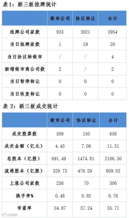 昨日三板共计658只股票成交,总成交额达11.5亿,其中做市公司成交4.45亿、协议转让公司成交达7.06亿元。