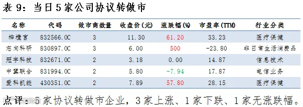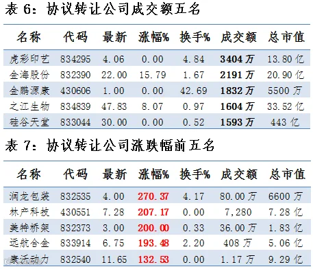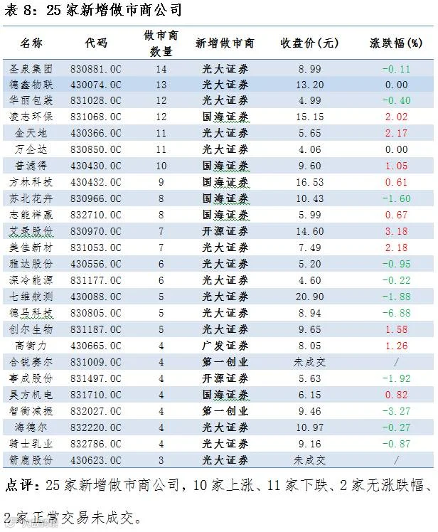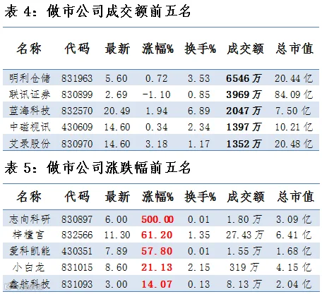 做市企业中有620只个股参与交易,成交额4.70亿元。其中292只个股上涨;6家做市企业成交额破千万,其中明利仓储、联讯证券和蓝海科技位列前三位,分别成交6546万、3969万元和2047万元。