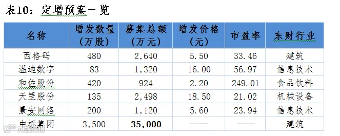 点评:6家公司共募集4.35亿元,定增企业行业分布中建筑与信息技术行业占比较大,募集资金最大的为中标集团3.5亿元。