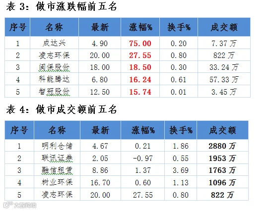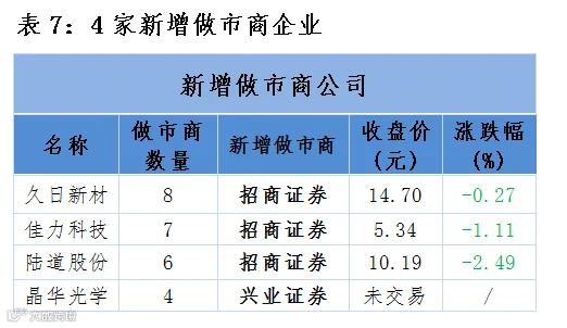 点评:4家新增做市商企业,主办券商分别是招商证券与兴业证券,其中招商证券占比较大。其中3家企业下跌,1家正常交易未成交。