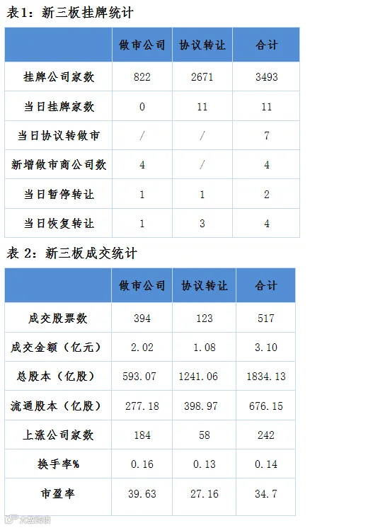 市场活跃度依旧不高,517只个股参与交易,其中242只个股上涨,占比46.8%。 成交额方面继续缩小至3.1亿元,其中做市公司成交2.02 亿、协议转让公司成交1.08亿。