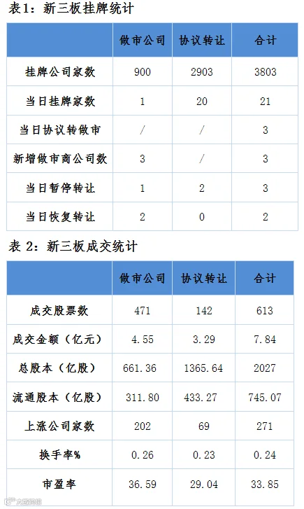 上周五三板有613只个股参与交易,其中271只个股上涨。成交额破7亿,报7.84亿元。其中做市公司成交4.55亿、协议转让公司成交3.29亿。