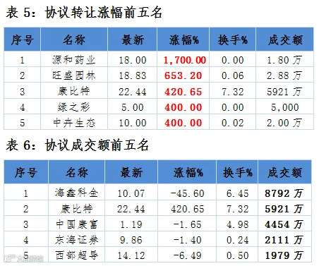 涨跌幅方面, 6只股票涨幅超过100%,其中源和药业、旺盛园林和康比特居前列,涨幅分别为1700%、653.20%和420.65%。相比之下,大铭新材、传视影视和希迈气象则跌幅居前分别为99.87%、93.86%和84.14%。