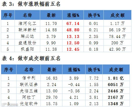 个股表现:当日13家公司成交额破千万。其中信中利成交额高达1.81亿元。海鑫科金与联讯证券随其后,分别成交8792万、6051万元。