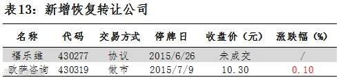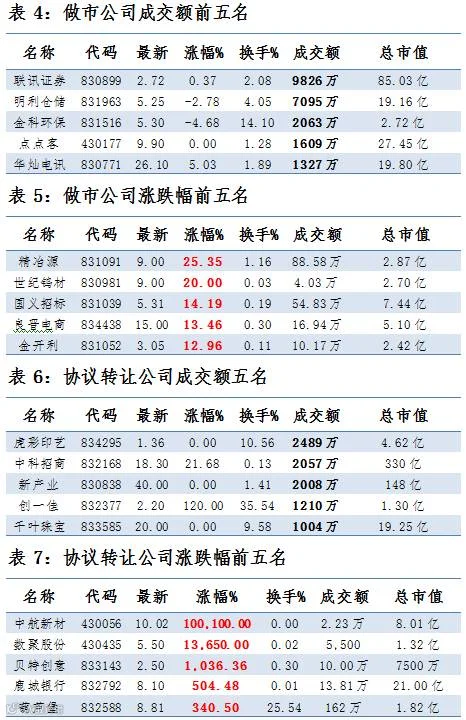 个股方面,明利仓储蝉联成交额排行榜第一名,但周成交额有所下降,仅为3.64亿元,联讯证券位居第二名,周成交3.15亿元。协议板块的南京证券上位排名第三,周成交1.03亿元。