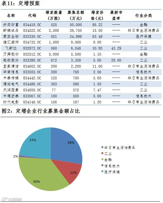 点评:12月17日,共有14家公司公布定增预案,总增发股数1.22亿股,共募集资金15.22亿元,3家公司募集资金超过1亿元,募集资金最大为好买财富,募集资金5.00亿元,总体来看,募集金额主要流向金融业,占比36%。