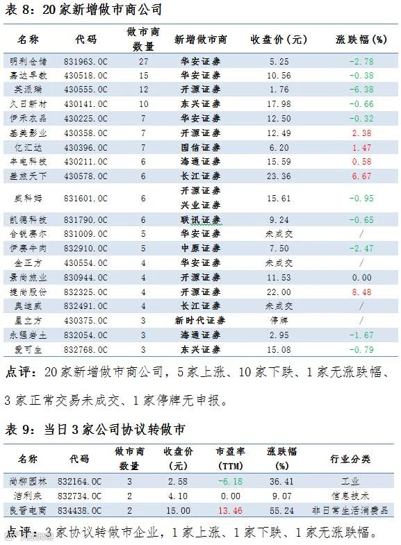 做市企业中有605只个股参与交易,成交额5.95亿元。其中277只个股上涨;11家做市企业成交额破千万,其中联讯证券、明利仓储和金科环保位列前三位,分别成交9826万、7095万元和2063万元。
