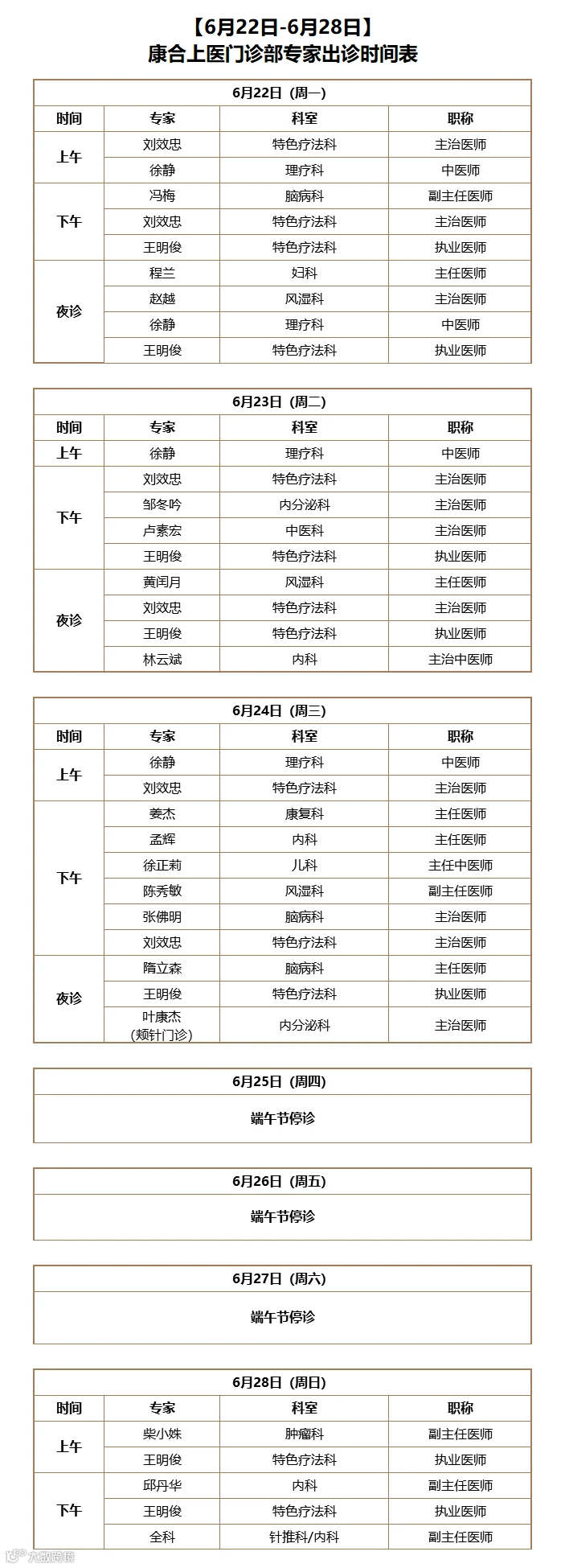 【6月22日-28日】康合上医门诊部专家出诊时间表 康合上医