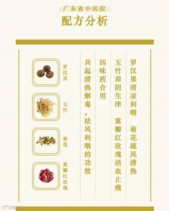精选罗汉果、菊花、玉竹、重瓣红玫瑰等药食同源草本成分,清热解毒,祛风利咽。