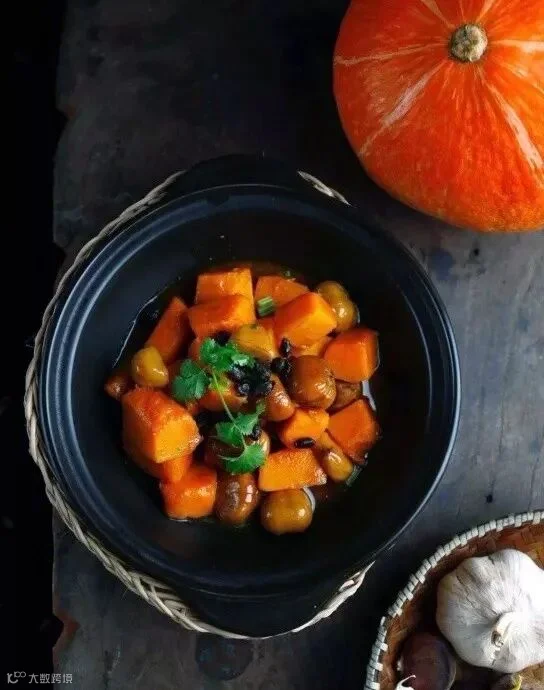 南瓜性温味甘,能润肺益气,化痰、疗便秘。辛温的蒜子搭配温养的栗子何南瓜,成就了一道补而不滞的素食,能增食欲、补脾肾。