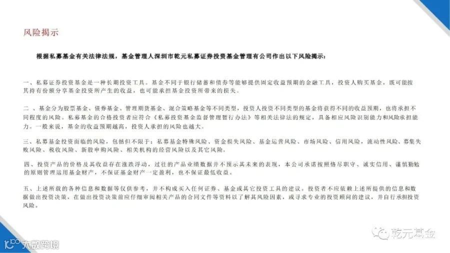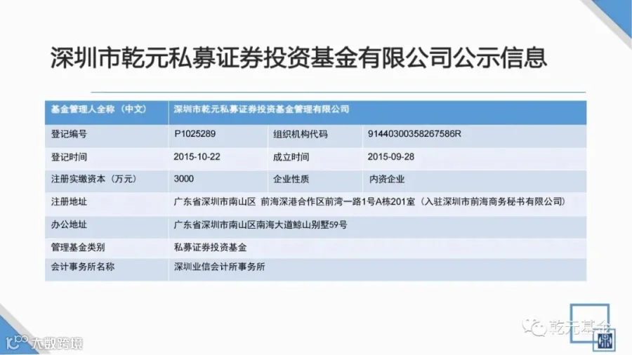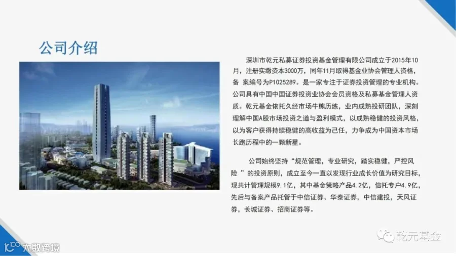 深圳市乾元私募证券投资基金管理有限公司成立于2015年10月,是一家专注于证券投资管理的专业机构。公司具有中国中国证券投资业协会会员资格及私募基金管理人资质。以为客户获得持续稳健的高收益为己任,力争成为中国资本市场长跑历程中的一颗新星。