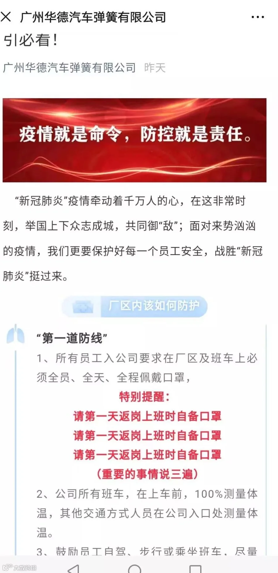 疫情已进入“严防死守“状态,要打赢防疫保卫战,唯有群防群控,群策群力,需要你我每个人的努力和参与,全员做好个人和家人的卫生防护,全员共建安全健康公司。