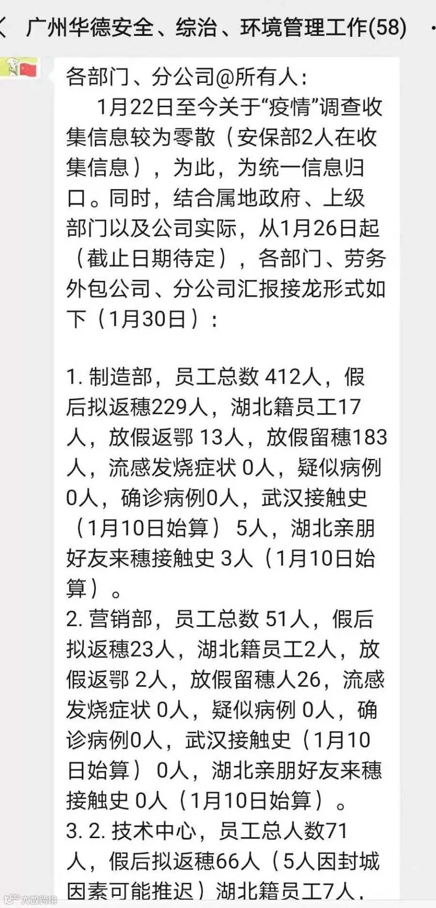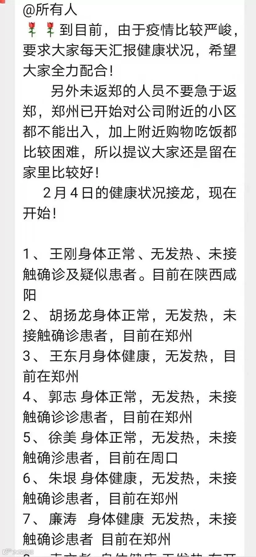 (二)组建防控网格,全面掌握员工身体健康情况、流动去向和过往接触史,结合春节节前全员信息登记情况,逐一确认员工假期动向;做好员工身体状况监测,实施全员“每日报告”身体状况,落实“早发现、早诊断、早治疗、早报告”的措施。