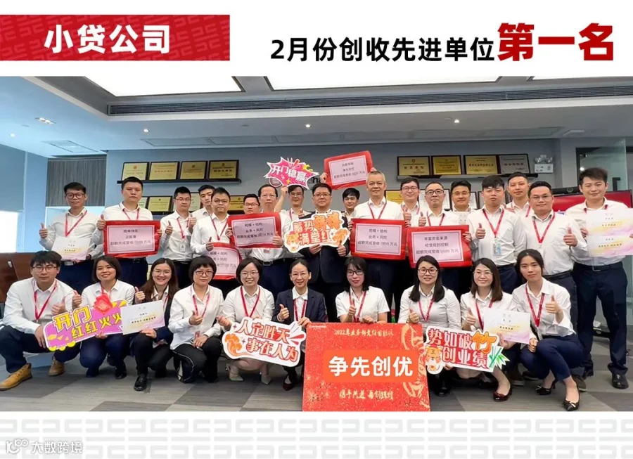 小贷公司获2月份创收先进单位第一名。小贷公司通过优化业务流程、组织员工系统学习的方式,夯实业务基础,提升内部效能;通过加强与各业务单位交流,拓宽协同展业思路;通过推行全员营销工作机制,营造凝心聚力的工作氛围。小贷公司将全力以赴,以坚定的信念和昂扬的斗志开展下阶段工作。