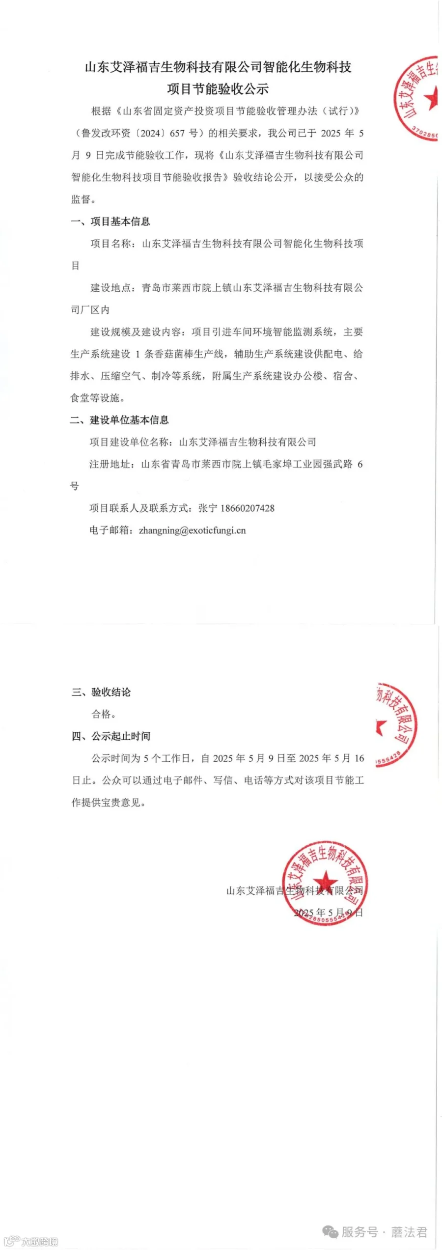 根据《山东省固定资产投资项目节能验收管理办法(试行)》(鲁发改环资〔2024〕657号)的相关要求,我公司已于2025年5月9日完成节能验收工作,现将《山东艾泽福吉生物科技有限公司智能化生物科技项目节能验收报告》验收结论公开,以接受公众的监督。