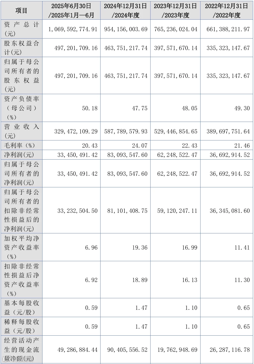 净利润从 2022 年的 3669.29万元增长至 2024 年的8309.35万元,2025 年上半年实现净利润 3345.05万元,扣非净利润同步提升,盈利质量较高。