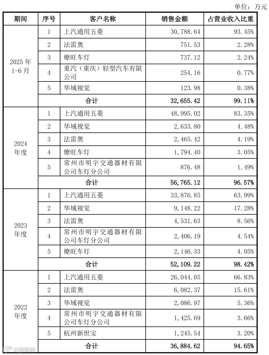 通宝光电前五大客户营收贡献占比常年维持在 94% 以上,2025 年上半年达 99.11%,客户集中度处于较高水平。其中,上汽通用五菱作为核心客户,销售占比从 2022 年的 66.83% 攀升至 2025 年上半年的 93.45%,合作深度持续强化;同时公司与法雷奥、华域视觉等全球知名汽车零部件企业保持稳定合作,客户结构覆盖头部整车厂与核心供应商。