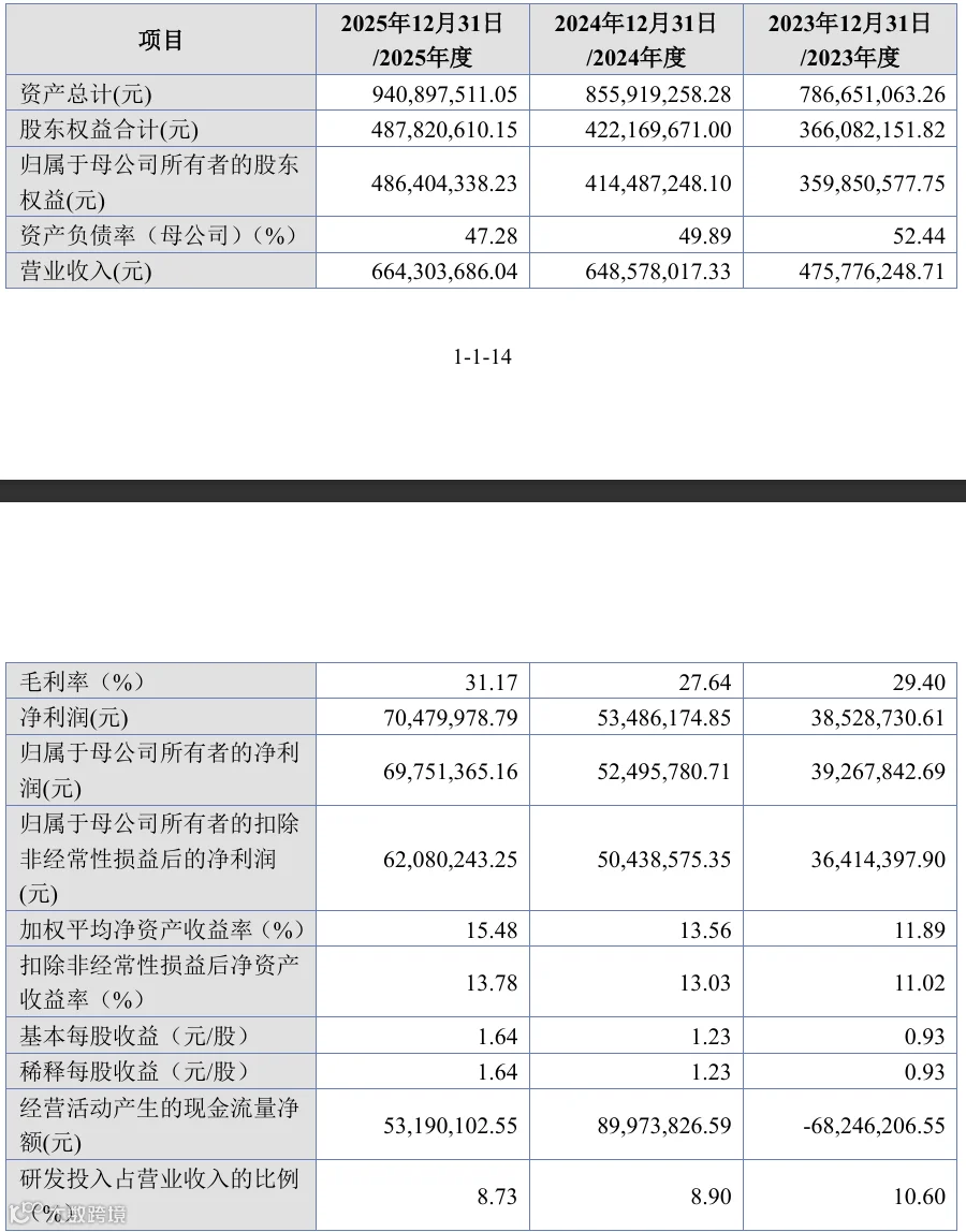 公司资本实力稳步扩张,资产总额从 7.87 亿元增至 9.41 亿元,归母股东权益从 3.60 亿元增至 4.86 亿元。研发投入始终保持高位,三年占比均在 8.7% 以上,为技术创新与长期发展奠定坚实基础。