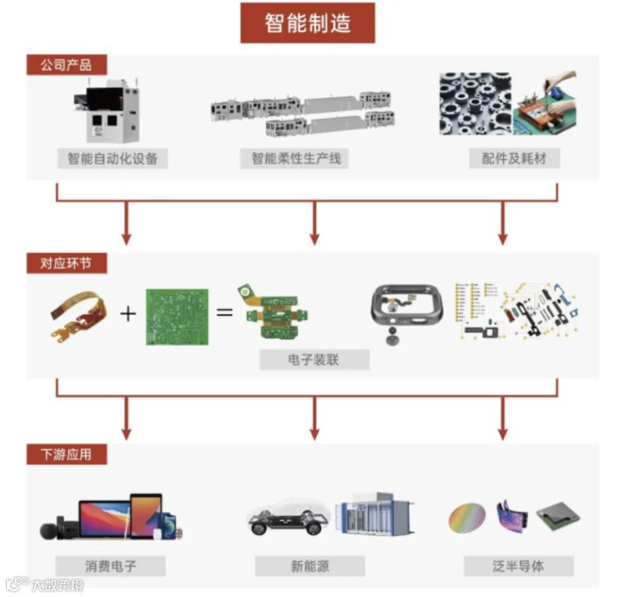 公司专业从事智能自动化设备、智能柔性生产线及配套配件耗材的研发、生产与销售,致力于为全球消费电子、新能源、泛半导体领域提供精密、稳定、可靠的智能制造解决方案。依托机构设计、高精度运动控制、柔性自动化、机器视觉及 AI 算法等核心技术,产品覆盖组装、检测、辅助全品类设备,可提供从单功能工作站到成套生产线的整体解决方案及装备改配升级服务。业务聚焦智能制造装联环节,从系统模组、产品总装逐步延伸至精密印制电路板 SMT 制造过程。