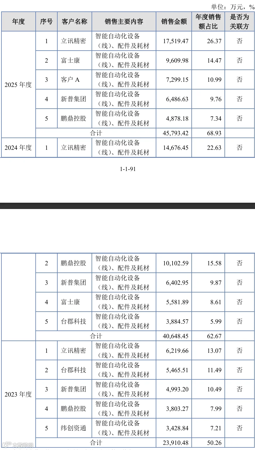 第一大客户立讯精密为全球消费电子精密制造领域龙头企业,对公司收入贡献从 2023 年的 6219.66 万元大幅增长至 2025 年的 1.75 亿元,收入占比从 13.07% 提升至 26.37%,双方业务深度绑定关系持续巩固。富士康作为全球规模最大的电子代工巨头、鹏鼎控股稳居全球印制电路板行业市占率首位、新普集团为全球领先的消费电子电池模组供应商,均为公司长期稳定合作客户,2025 年分别贡献 9609.98 万元、4878.18 万元、6486.63 万元收入。台郡科技、纬创资通等全球顶尖柔性电路板厂商与电子 ODM 服务商亦在公司核心客户之列。