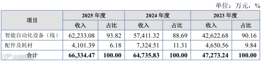 公司业务结构高度聚焦,核心主业智能自动化设备(线)收入占比始终稳定在 90% 左右,2025 年进一步提升至 93.82%,收入规模从 4.26 亿元增长至 6.22 亿元,成为公司业绩增长的绝对核心引擎,凸显公司在智能制造装备领域的核心竞争力与市场认可度。