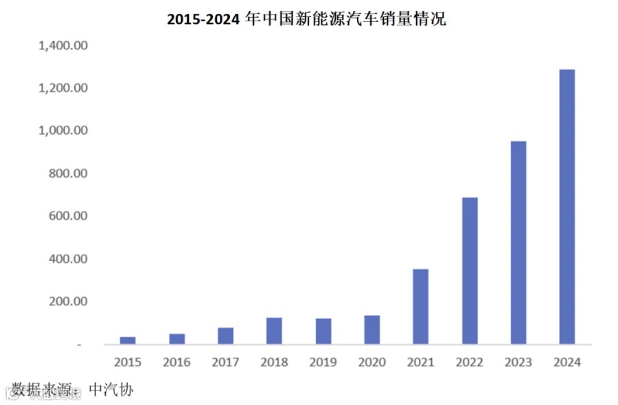 新能源汽车领域:新能源汽车领域延续高增长态势,销量从 2015 年 33.1 万辆攀升至 2024 年 1286.6 万辆,年均复合增长率达 50.18%,全球市场份额超 70%,产能扩张带来广阔增量空间。