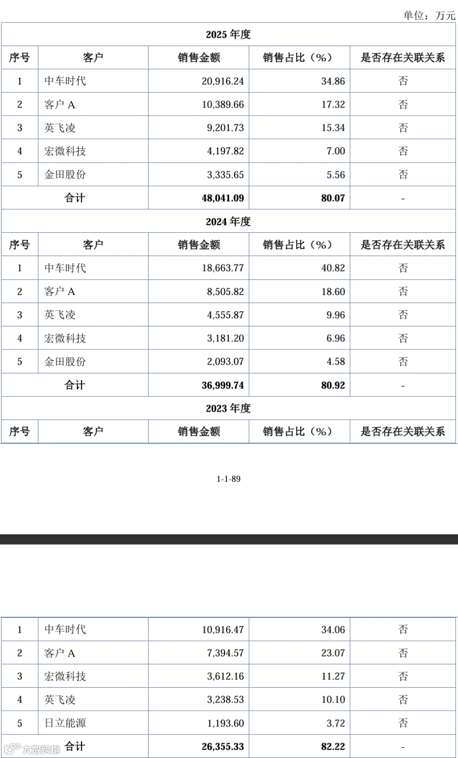 报告期内,公司前五大客户合计销售占比始终稳定在 80% 左右,合计销售规模从 2.64 亿元大幅攀升至 4.80 亿元,与核心客户的合作深度持续兑现。
