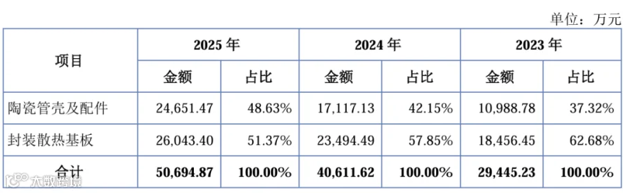 陶瓷管壳及配件业务实现翻倍式增长,营收从 10988.78 万元攀升至 24651.47 万元,营收增速显著领先,带动其营收占比从 37.32% 持续提升至 48.63%。