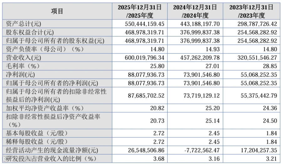 2023-2025 年,公司经营业绩实现持续跨越式增长,成长性与盈利质量双优。营业收入从 3.21 亿元稳步攀升至 6.00 亿元,归母净利润从 5506.83 万元增长至 8807.79 万元,连续三年实现营收、利润双增长,成长动能强劲。