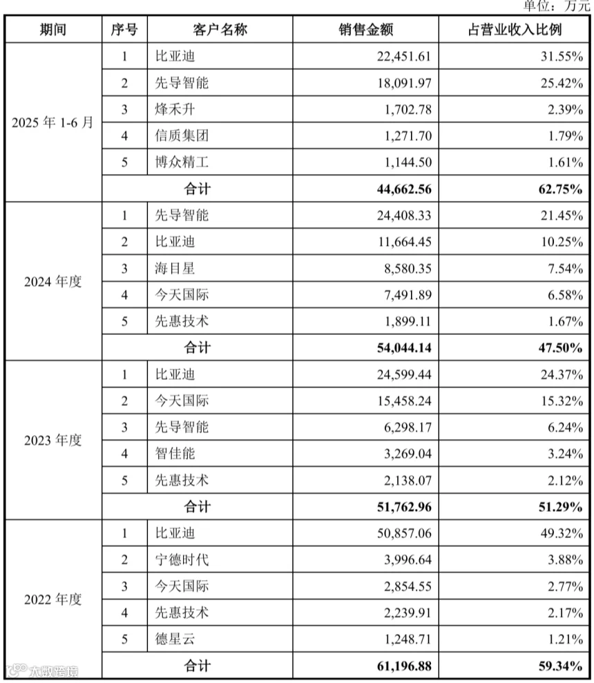 从客户销售结构来看,公司前五大客户营收占比长期维持高位,凸显核心客户合作粘性深厚。公司客户群体以比亚迪、先导智能等新能源及高端装备领域龙头企业为主,该类客户合作关系的稳定性充分印证了公司产品的核心技术实力与市场认可度。