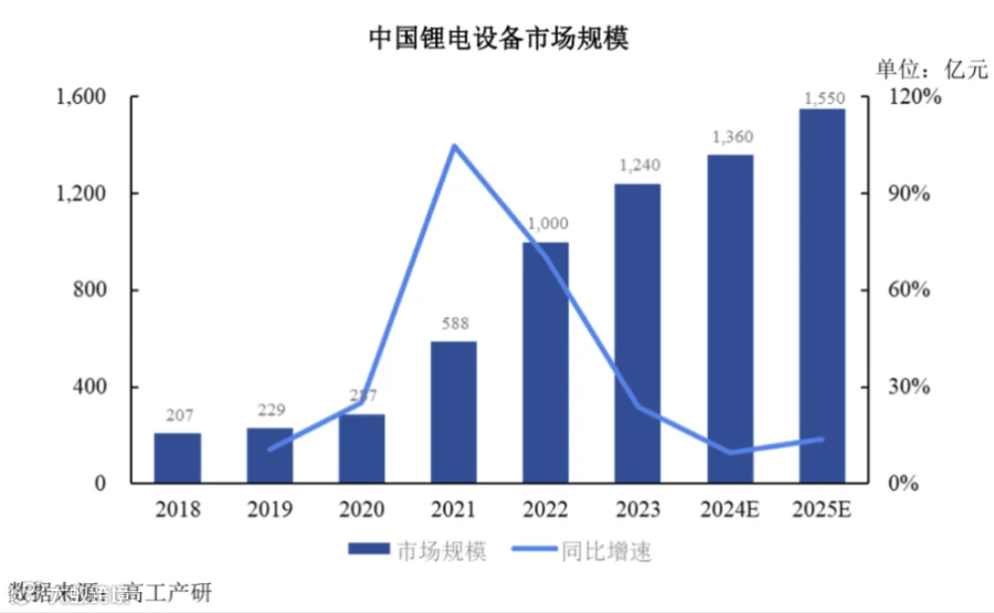 随着全球新能源汽车、储能等产业的快速发展,下游锂电池需求持续增长,直接驱动我国锂电制造设备市场规模不断扩大。根据高工产研数据,2023 年我国锂电设备市场规模达到 1,240 亿元,2018-2023 年 CAGR 高达 43.05%;预计 2023-2025 年我国锂电设备市场将维持千亿级规模,2025 年有望突破 1,500 亿元,为公司核心业务提供广阔市场空间。