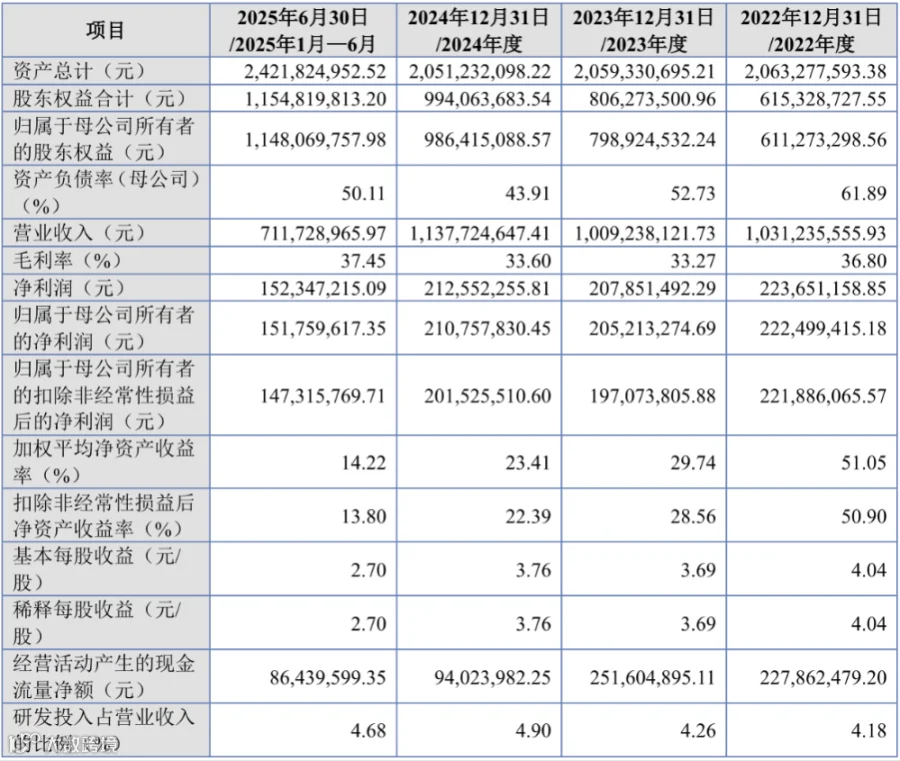 公司毛利率呈稳中有升格局,2025 年上半年达 37.45%,较前两年明显提升,彰显产品溢价能力与成本管控效率的双重提升;尽管营收规模受阶段性行业因素影响有所波动,但核心盈利指标表现坚韧,2025 年上半年归属于母公司所有者的净利润达 1.52 亿元,扣非净利润 1.47 亿元,核心业务盈利能力扎实,盈利韧性凸显。