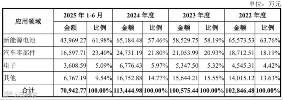 从应用领域来看,公司营收高度聚焦新能源电池赛道,2025 年 1-6 月占比达 61.98%,成为第一大收入来源;汽车零部件领域为第二大收入贡献板块,占比 23.40%,且占比呈逐年提升趋势;电子及其他领域占比相对偏低。结合核心产品的高集中度特征,可见公司深度绑定新能源高景气赛道,充分享受行业增长红利。具体数据如下: