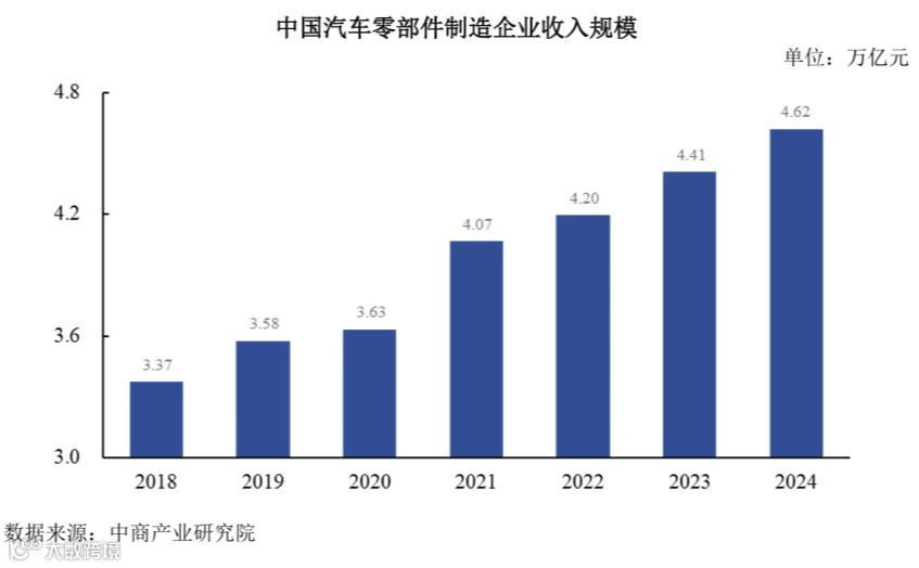 在我国汽车产销量稳步扩大、新能源汽车市场渗透率持续提升的行业背景下,我国汽车零部件行业凭借规模优势及新能源领域先发优势实现稳健增长。根据中商产业研究院数据,2022-2024 年我国汽车零部件制造企业收入规模分别为 4.20 万亿元、4.41 万亿元和 4.62 万亿元,呈现持续稳步增长趋势。
