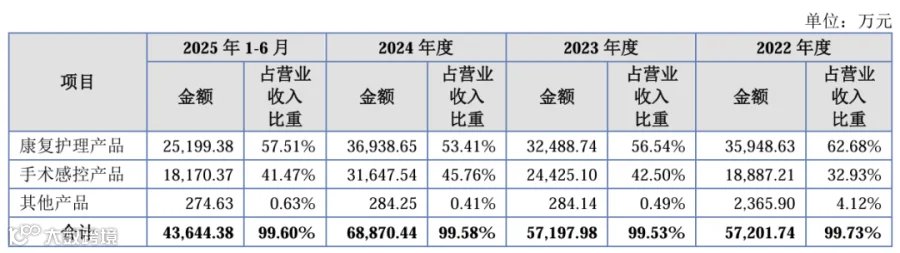 公司营业收入以康复护理产品、手术感控产品为核心支柱,其他产品占比极低,2023 年起占比已不足 1%,收入结构集中度较高且稳定性强。