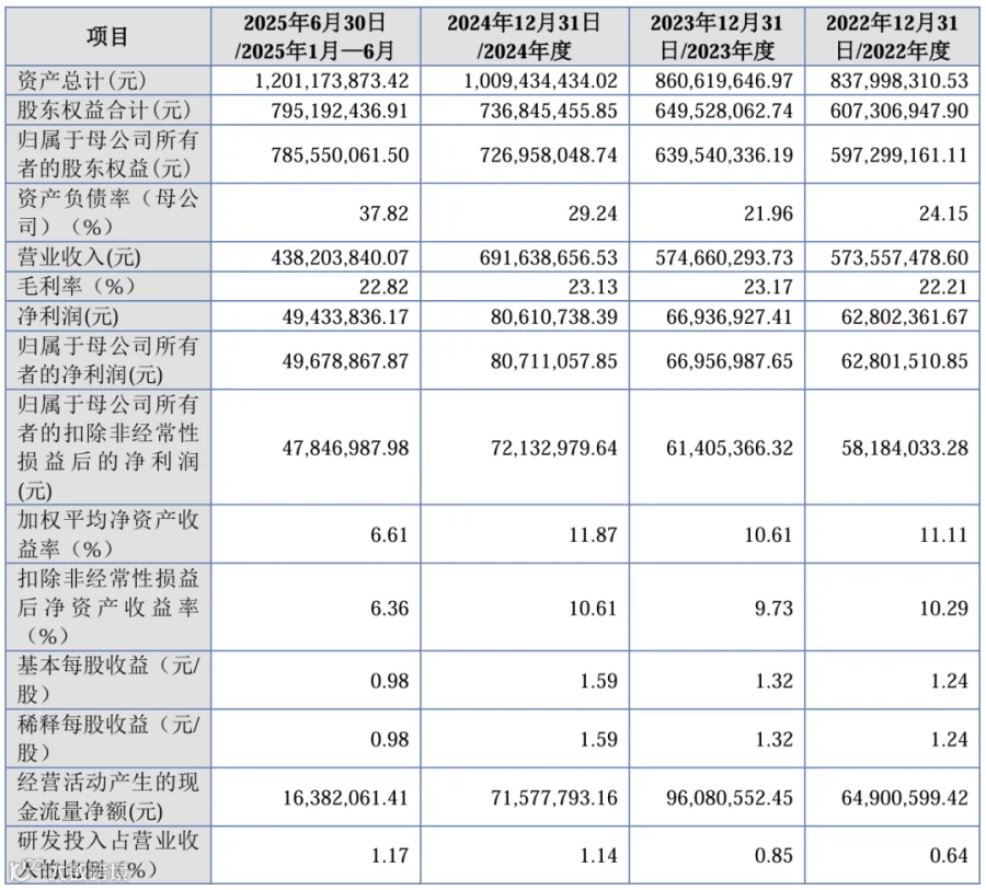 其次,营收与盈利持续向好:营收规模实现阶段性突破,2024 年营业收入达 6.91 亿元,较 2023 年增长超 20%,2025 年上半年已完成 4.38 亿元;盈利水平稳步提升,归母净利润从 2022 年的 6280万元增长至 2024 年的 8061万元,毛利率长期稳定在 22%-23% 区间,盈利质量与稳定性突出。