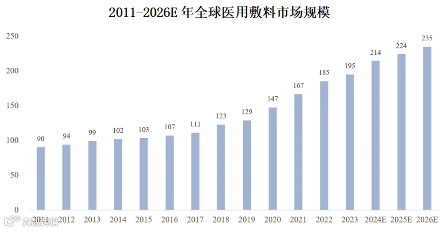 医用敷料作为医疗健康消费的刚性需求产品,全球市场规模长期保持稳步增长态势。根据尚普咨询统计数据,2011-2023 年,全球医用敷料市场规模从 90 亿美元增长至 195 亿美元,增长态势稳健。随着全球人口老龄化问题日益突出,溃疡、褥疮等相关病症患者数量持续增加,将进一步拉动医用敷料市场需求。尚普咨询预计,2026 年全球医用敷料市场销售收入规模将达到 235 亿美元,行业发展潜力可观。