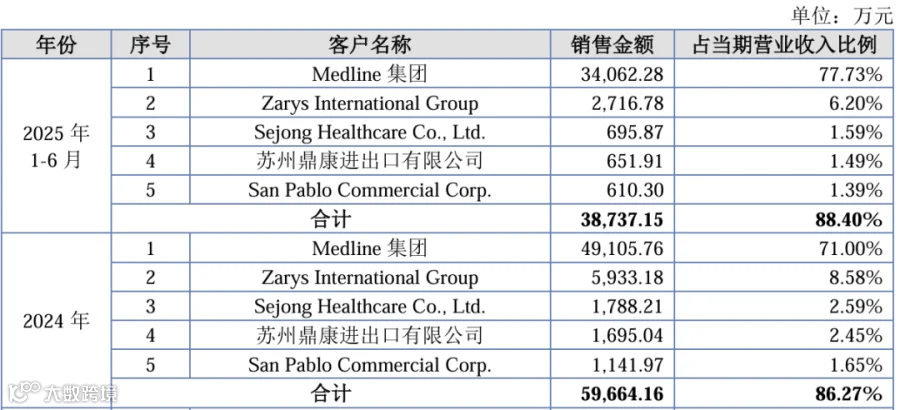 2025 年 1-6 月、2024 年度前五大客户合计销售收入占比分别为88.40%、86.27%,客户集中度较高。其中,Medline 集团为公司核心战略客户,合作粘性持续强化:2024 年度销售金额 49,105.76 万元,占营收比例 71.00%;2025 年 1-6 月销售金额 34,062.28 万元,占比进一步升至 77.73%,单一客户依赖度较高的风险需重点关注。未来,公司将在稳固现有合作关系的基础上,积极拓宽业务渠道、开发新客户,提升业绩的可持续性与抗风险能力。