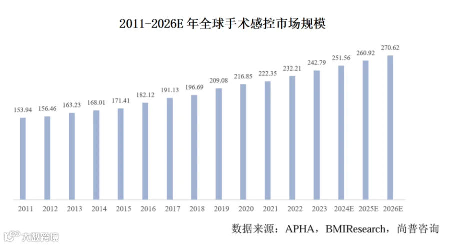 手术感控产品包括手术铺单、手术衣、手术组合包等,是外科有创操作不可或缺的医用耗材,核心作用是建立无菌手术创面区,阻止外来物质及微生物侵入手术创面或患者体液、血液,避免污染术者、医者及手术环境。近年来,随着外科手术数量持续增长,以及医疗领域对感染控制措施的不断加强,手术感控产品市场需求呈持续增长态势。公开数据显示,2019 年全球手术感控市场规模突破 200 亿元,此后以每年 4-5% 的增速平稳增长,2023 年市场规模达到 242.79 亿元;若增速保持稳定,预计 2026 年市场规模将达到 270.62 亿元。