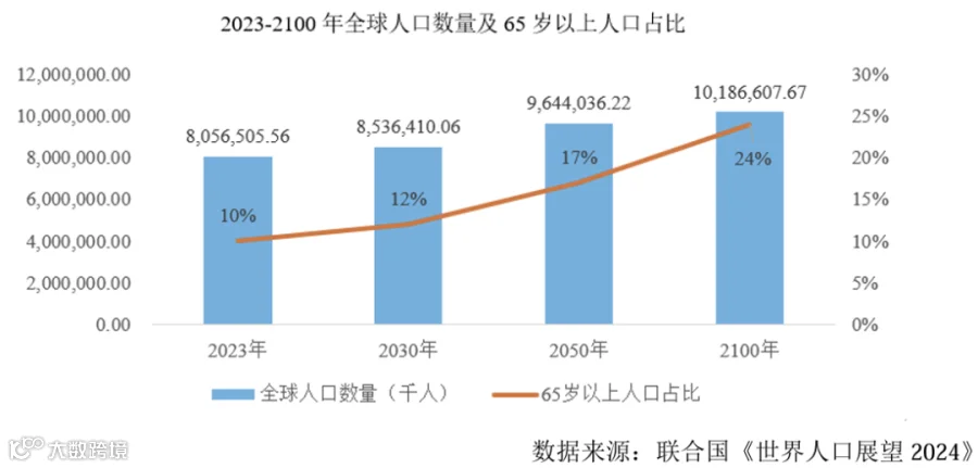 全球老龄化进程加速,据联合国《世界人口展望 2024》预测,2023 年至 2100 年全球人口将从 80.57 亿增至 101.87 亿,65 岁及以上人口为增长最快年龄组,占比将从 2023 年的 10% 升至 2050 年的 17%、2100 年的 24%。