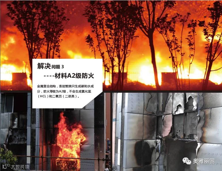 金属复合结构,表层燃烧只生成碳和水成分,防火等级为A2级,不会生成氯化氢(HCL)和二氧芑(二恶英)。