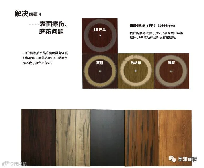 3D立体木质产品的膜层具有5H的铅笔硬度,磨花试验1000转磨伤而透底,颜色更保证。