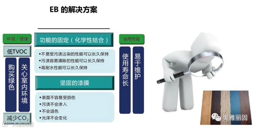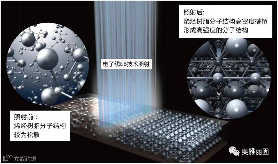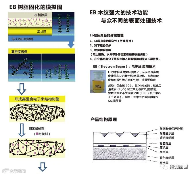 EB技术将液体烯烃固体化,从而形成高硬度涂层,与UV(紫外线)涂层相比,在表面硬度和耐候性等方面的性能、质量更稳定。