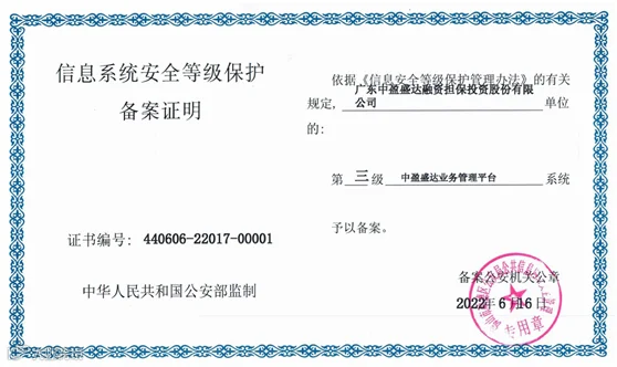 近日,中盈盛达顺利通过信息安全等级保护三级测评,获得由中华人民共和国公安部门核准颁发的信息系统安全等级保护第三级备案证明,该证书的获得是国家权威机构对中盈盛达技术优势、运营能力、风控实力和信息安全能力的高度认可。